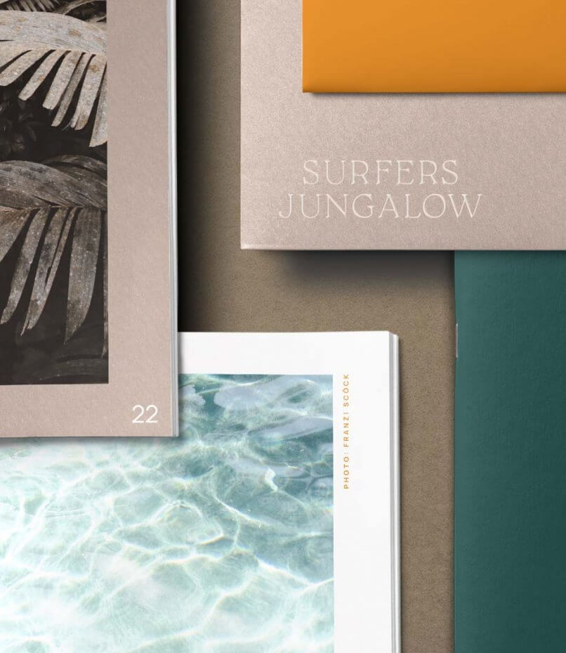 Die Aufgabe war es, Surfers Jungalow als professionelle Marke visuell zu unterstützen und ein Corporate Design zu definieren. Am Anfang des Grafikdesigns stand dabei das Logo. Es sollte nicht nur die drei Hauptthemen Interior Design + Plants + Surf auf einen Blick vereinen sondern auch mit der Marke mitwachsen können. Dazu wurden verschiedene Logovarianten optimiert, angepasst auf das Einsatzgebiet. So wird ein einwandfreies visuelles Erscheinungsbild im Grafikdesign garantiert. (Favicon, Patch, Wortmarke und Wort- Bildmarke)