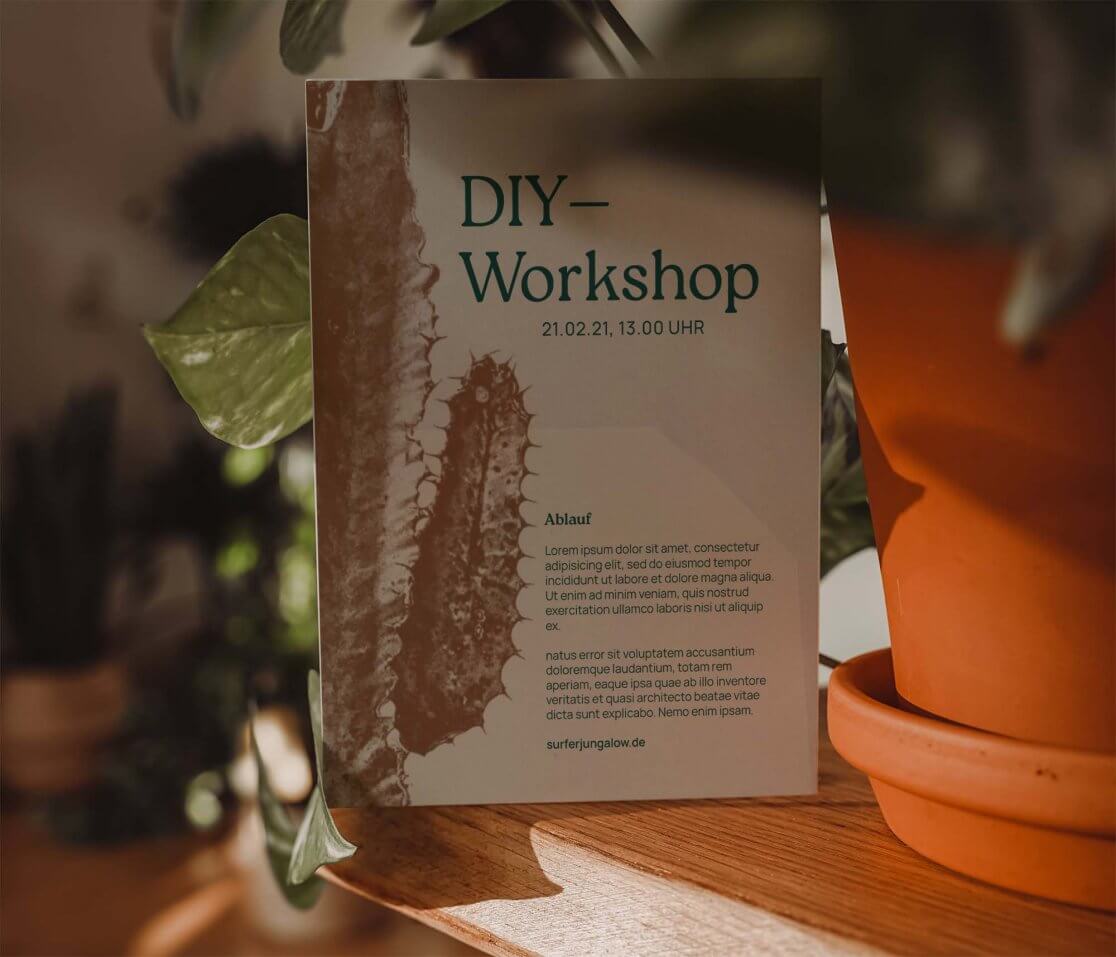 Diese dynamische Systematik sollte sich auch in den Gestaltungselementen wiederfinden. Dabei wurde eine Art Baukastenprinzip entwickelt, mit Hilfe dessen zukünftig Instagram Posts, Flyer, Kleidung, Einladungen, Newsletter… eigenständig gestaltet werden können. Teil dieses Baukasten ist die Farbwelt, die sich aus dem Einrichtungsstil von Surfers Jungalow ableitet, die Pflanzen und die Papercut Formen. Letzteres unterstreicht den DIY Charakter der Marke als Blog. Alle drei Elemente bilden die Basis der Gestaltung.